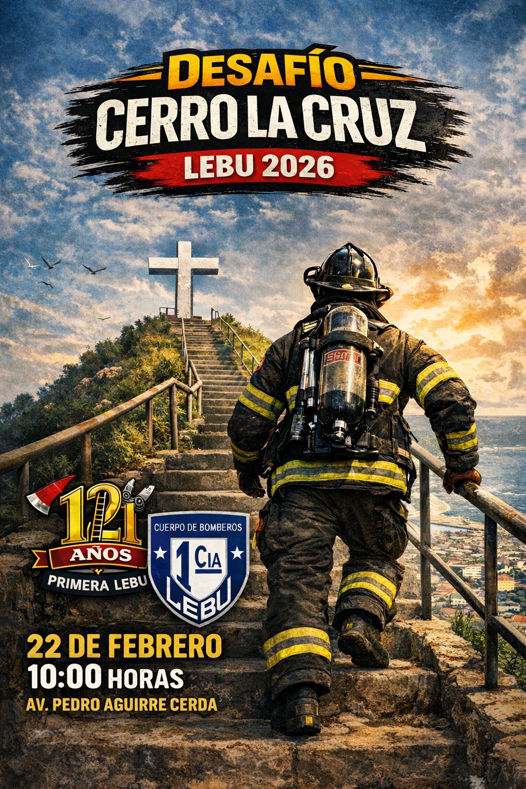 Por primera vez, la comuna de Lebu será escenario de una competencia de resistencia bomberil. Se trata del “Desafío Cerro La Cruz”, una actividad que pondrá a prueba a bomberos y bomberas que, equipados con su tradicional traje estructural, deberán ascender las escaleras que conducen hasta la icónica Cruz ubicada en lo alto de la ciudad, para luego descender por calles y senderos en un recorrido que supera los 1.400 metros.